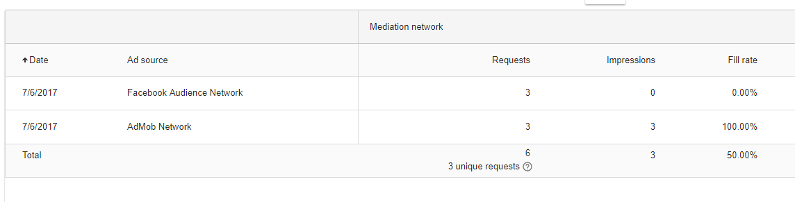 On the AdMob dashboard I see the N requests yet 0 impressions for Facebook: